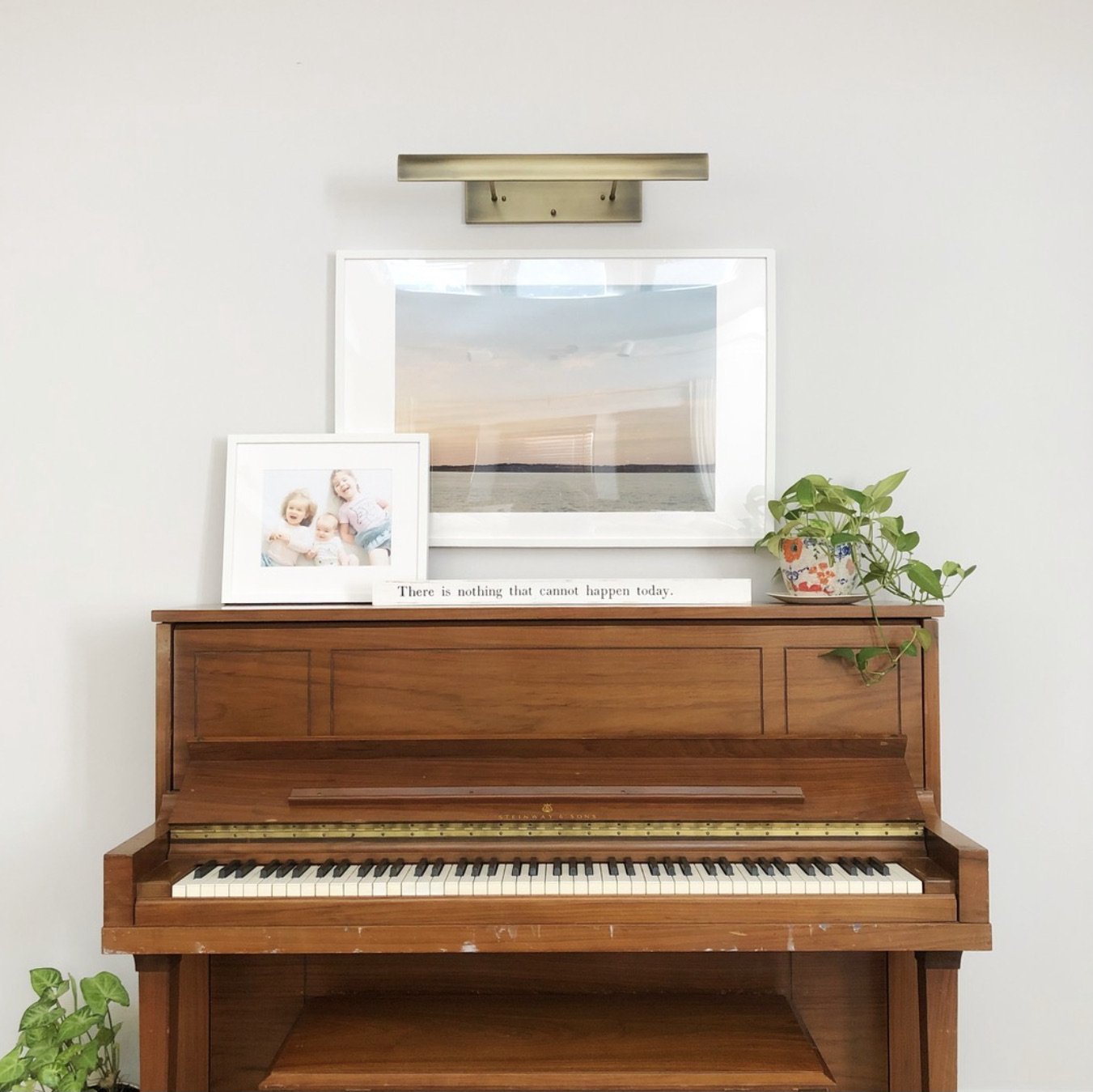 The bottom line is I am here today to tell you, it can be done. It’s actually way bigger in our minds than it is in real life (to print those pictures and refresh the walls in your home). I printed brand-new pictures. I even did some artwork and hung those four beautiful frames for $20. I had to buy a little hardware kit on Amazon for a few dollars. Then I got a $10 photo printed at Walgreens. That’s not always what I recommend, but when you want to get something done, Walgreens is the way to go. They always have discount codes on photos and they do same-day printing. It’s pretty decent. I spent a few dollars on some calligraphy pens so that I wouldn’t have buy artwork. I just did it myself. Now, it has made me so happy.